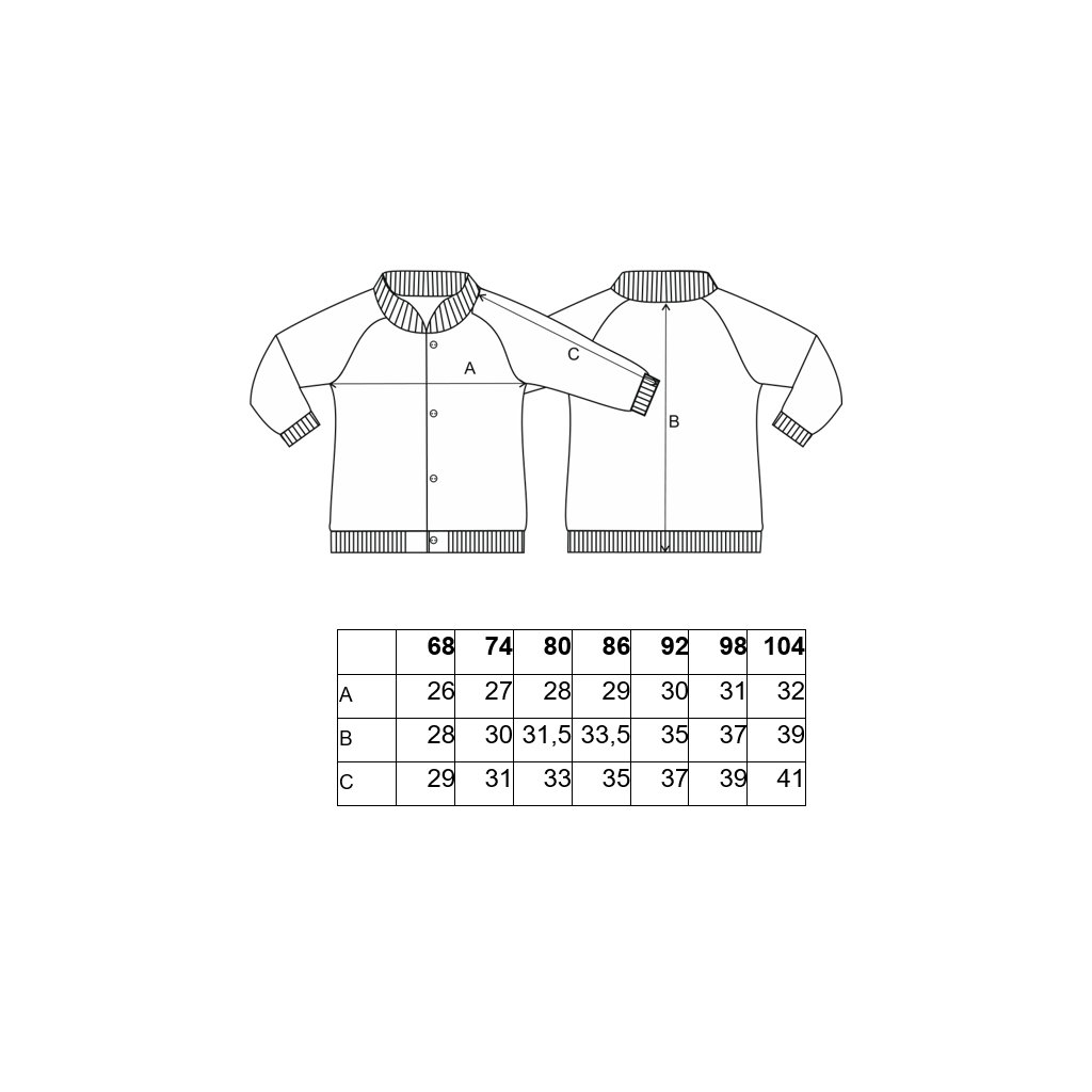 Kabátek je módního střihu, zapíná se pomocí knoflíčků Little Angel® z přírodního materiálu a rukávky kabátku lze ohrnout do manžety. Materiál kabátku je velmi
